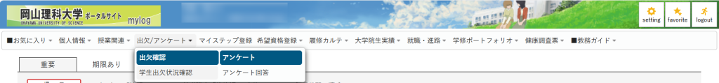 mylogにログイン後、「出欠/アンケート」をクリックし、「学生出席状況確認」をクリックしてください。