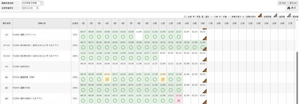 下記のような出欠状況確認が表示され、授業に出席しているか否かを確認することができます。