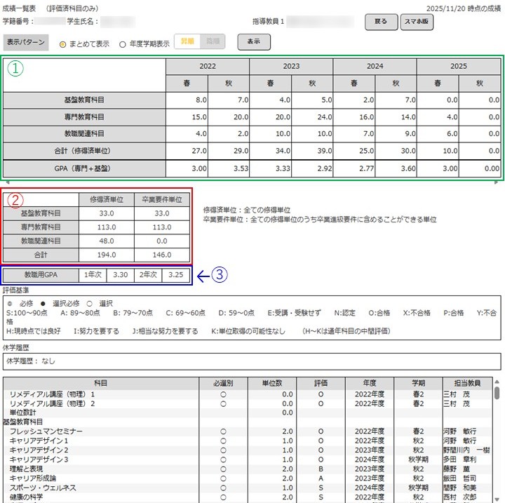 - 各学年・各開講期ごとの修得単位数を確認したい場合