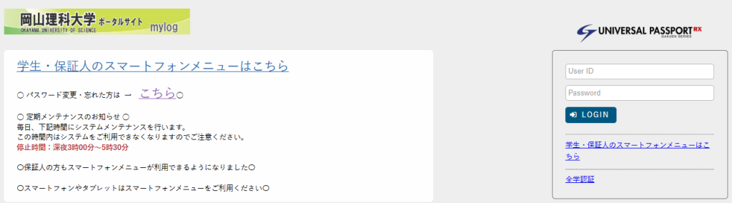 岡山理科大学ポータルサイトmylog(マイログ)を通じて、学生は大学からの連絡や講義の履修登録、講義資料の閲覧、レポート等の提出などを行え、保護者の方は大学からの連絡やお子様の成績の閲覧などが行えます。