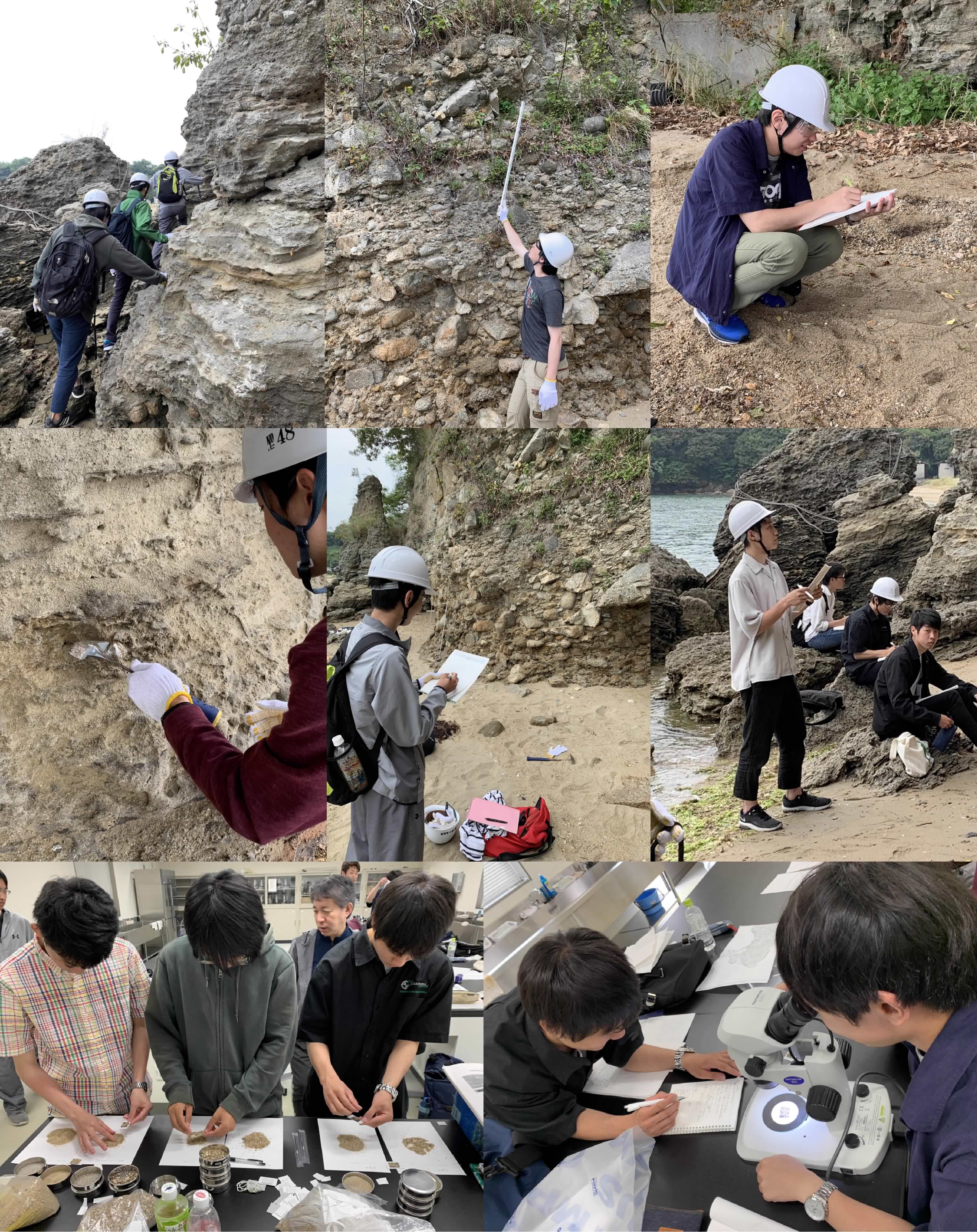 2日は地質調査です。前島のいろいろな地質を調査し、前島のでき方などを学びました。また、いくつかの土壌を持ち帰り粒度分析なども行いました。