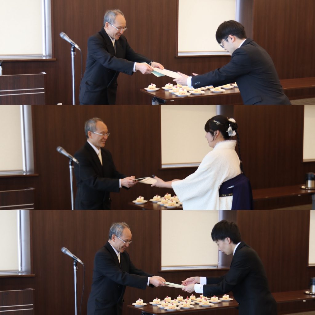 基礎理学科からは、鎌滝研の平松くんと檜垣くん、新原研の渡邊さんの3名が受賞し、理学部長から賞状と副賞が授与されました。