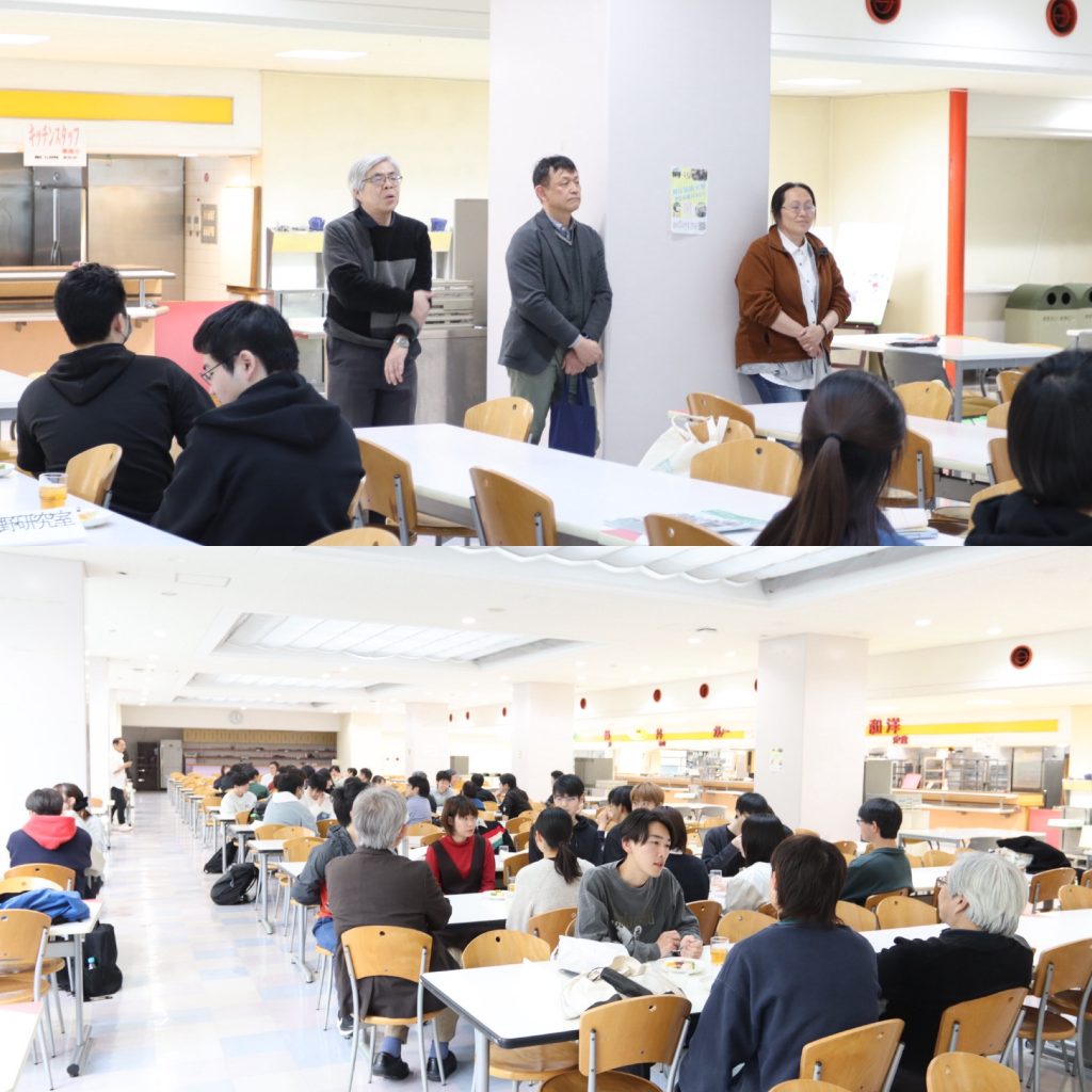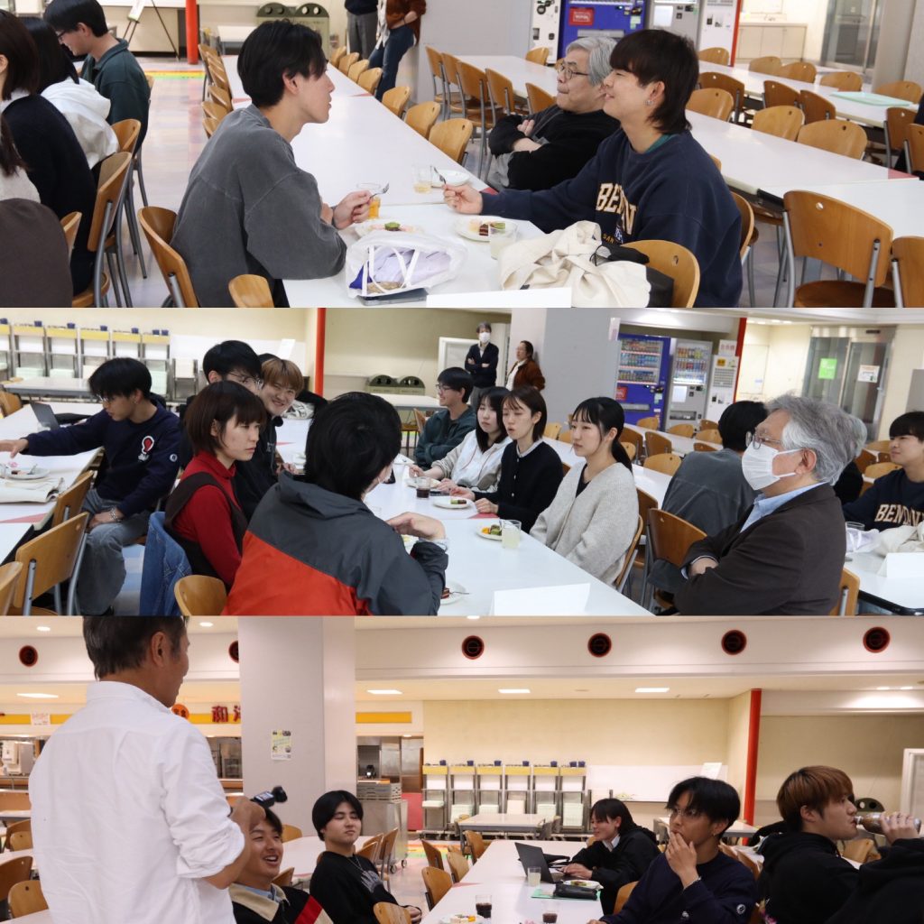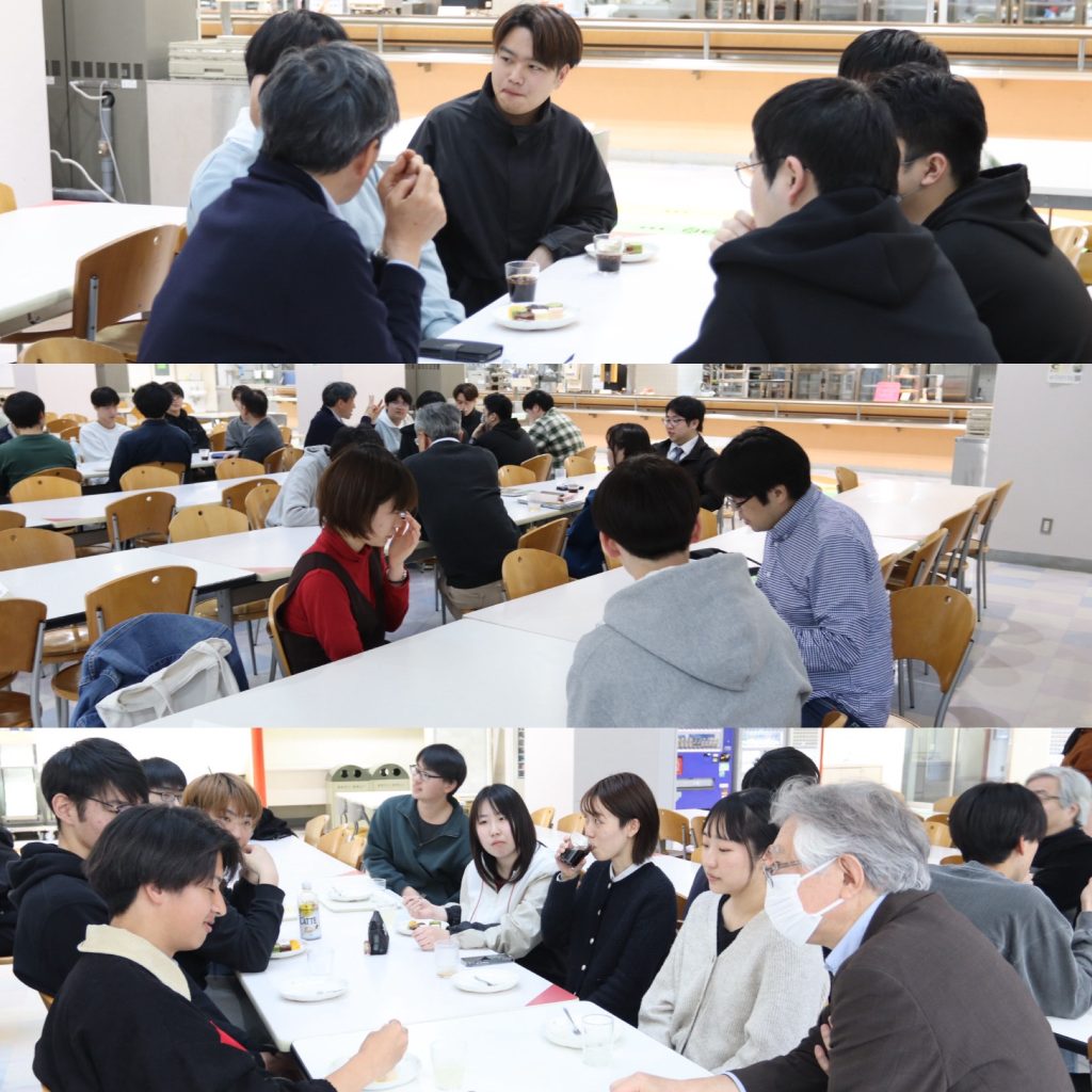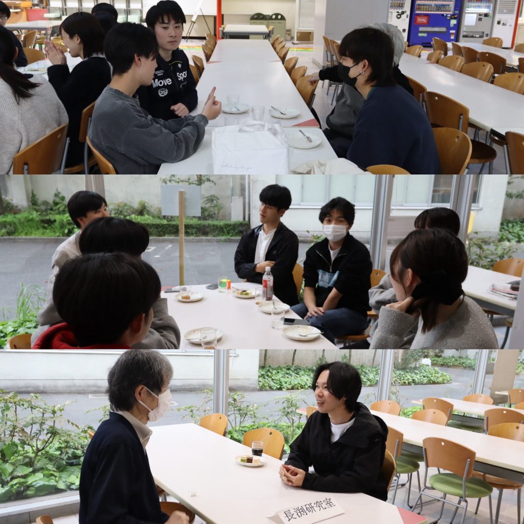 月22日の5限にたんぽぽにて、「教員・院生と話そう会」が開催されま した。本会では、主にこれから研究室を選ぶ3年生を対象に、教員や研究室所属の先輩と、ケーキを食べながら研究室の様子や研究の内容を語り合いました。 3年生は秋学期の探究ゼミから研究室に所属しますので、悔いのないように行きたい研究室を選んでくださいね。もっと知りたいときは、研究室を訪ねて、先輩や先生方にいろいろ聞いてみましょう。